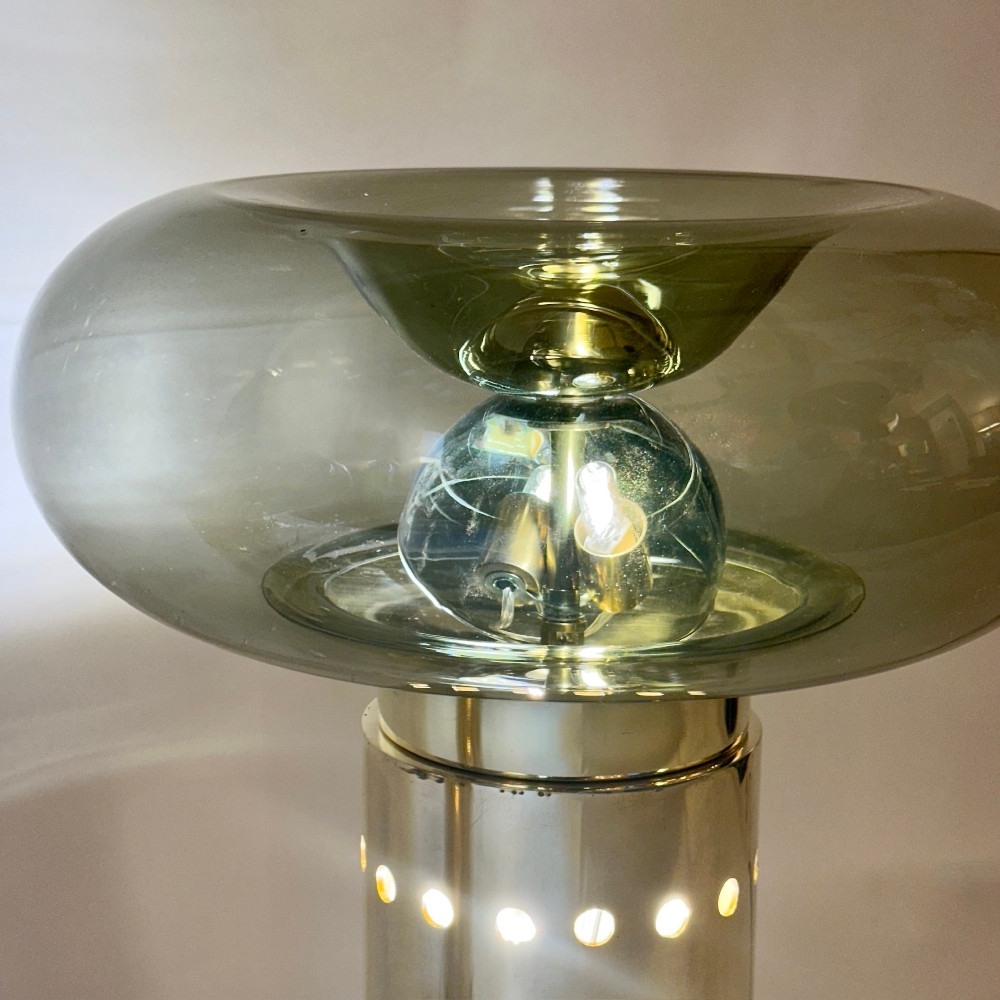 This pair of modern table lamps with smoked grey blown Murano art glass diffusers fit almost any kind of environment and they are perfect to be placed either on any leaving room or any bedroom.
