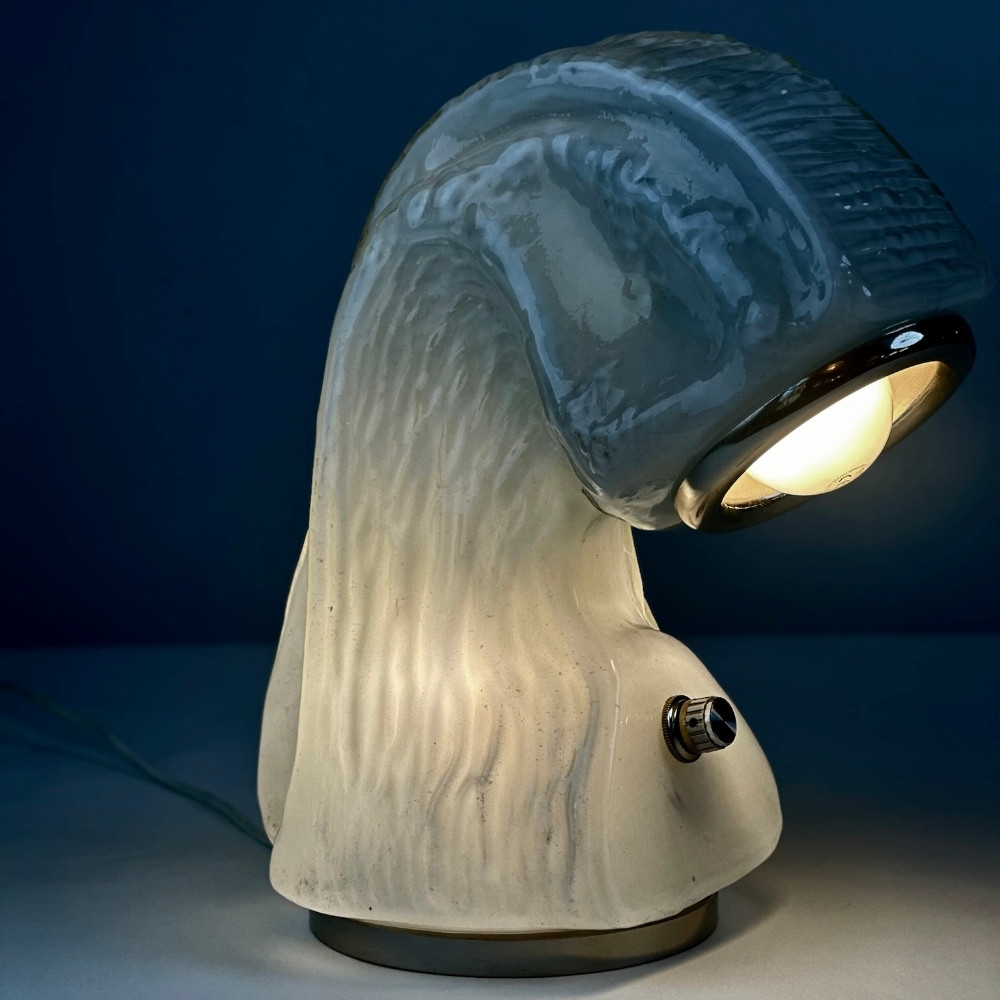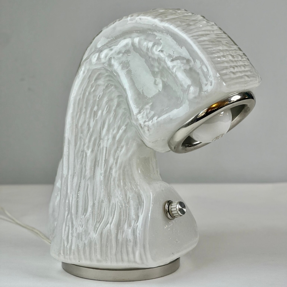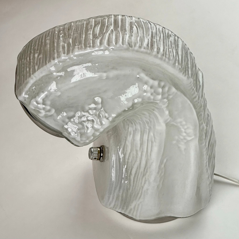 Osso (Bone) Murano glass bark effect table lamp by Carlo Nason for Mazzega. This lamp is part of biomorphic free-form shaped glass shells, this piece features a milky glass diffuser with a thin steel basement that creates an iceberg visual effect.