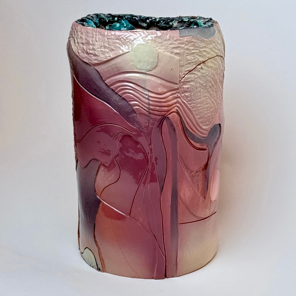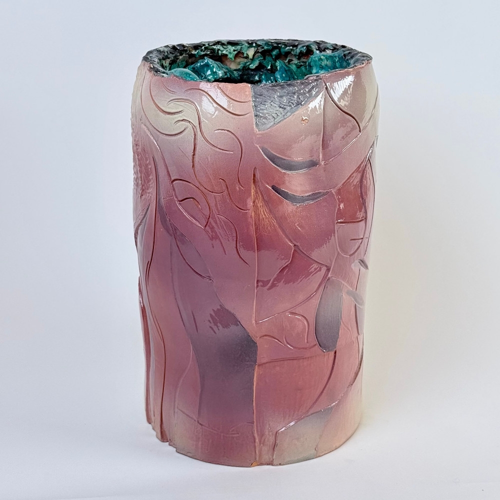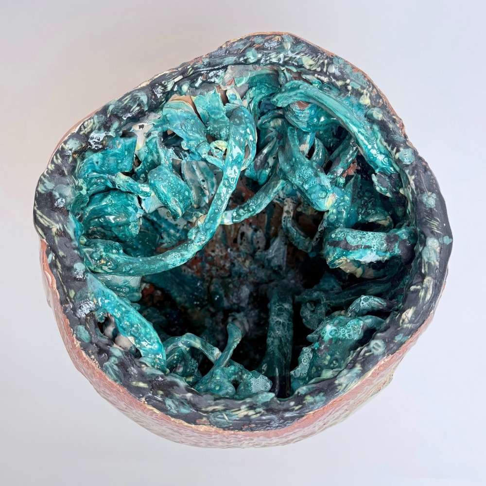 His "vases", above all, are ambiguously and formally presented as objects of domestic use, only to prove impossible to accommodate other living forms as they are already overflowing with internal life. This sort of underbelly of the object, offered to the viewer's gaze, is a sort of "cavern" in which the pulsating organs of life appear in all their radiant vitality. Branches and leaves intertwine with other brightly coloured forms and the harmony of the work echoes that of real nature.