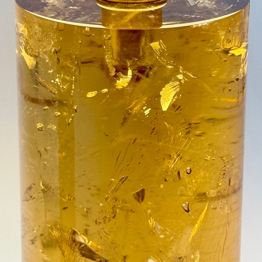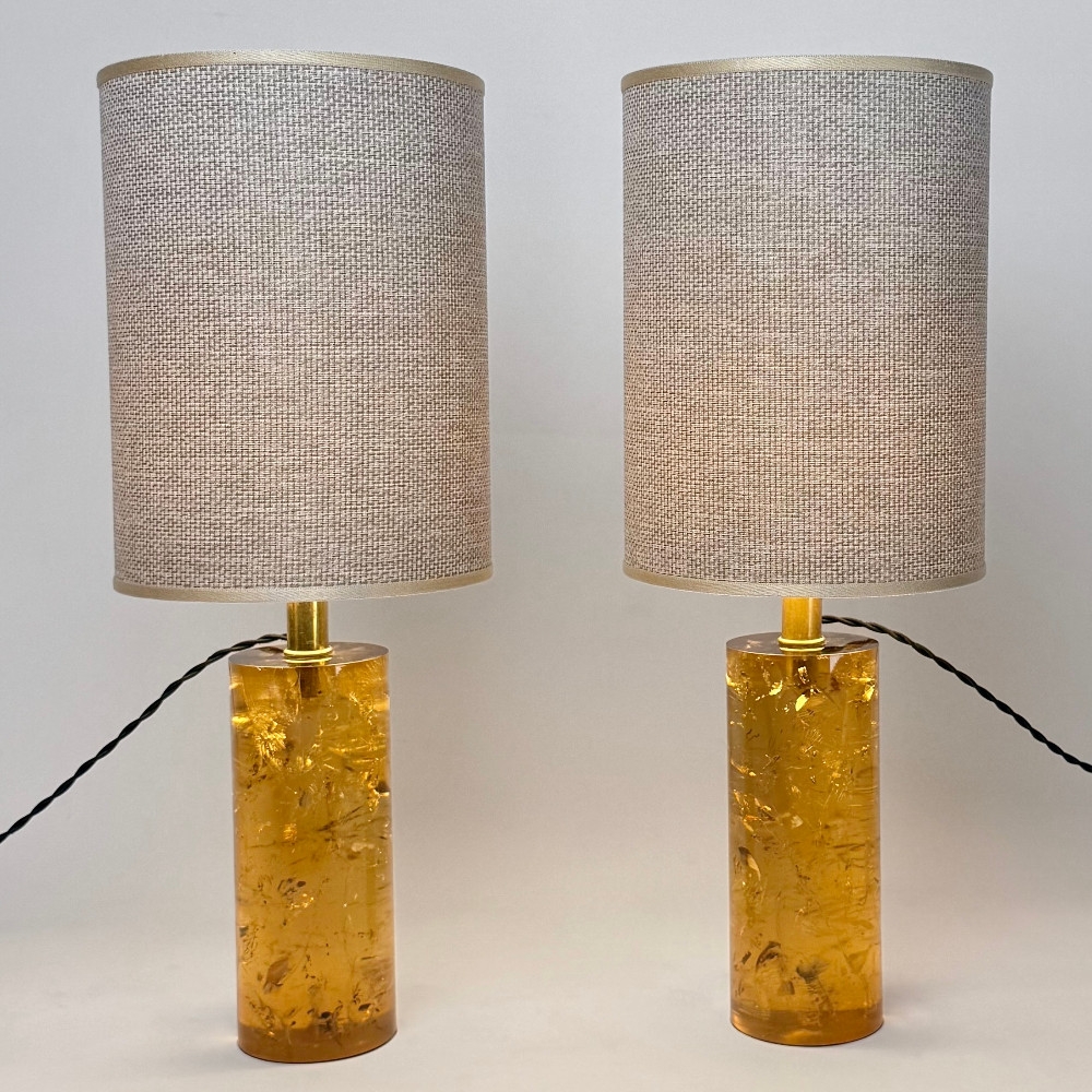 Pair of exceptionally clear Italian fractal resin table lamps with brass fittings and new black silk electric threads. Perfect lamps to be placed on night stands.