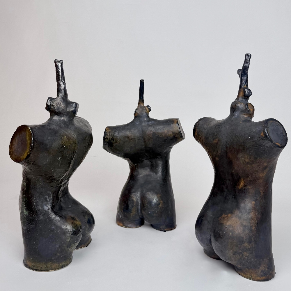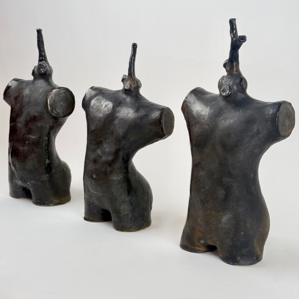 Interesting set of three sculptures representing the merging of human nature with human kind. The black torsos have an incredible oxidized patina that makes them rather unique and beautiful. Perfect size to be showned inside a cabinet of free standing. Signed pieces